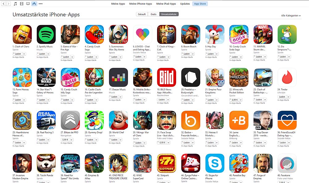 Unter den 50 umsatzstärksten Apps im gesamten iTunes App Store befinden sich allein 15 Online-Multiplayer-Strategiespiele. Die umsatzstärksten Apps sind die, wo die Spieler am häufigsten mit In-App-Käufen vermeintliche Vorteile im Spiel mit echtem Geld einmal oder mehrfach zukaufen.